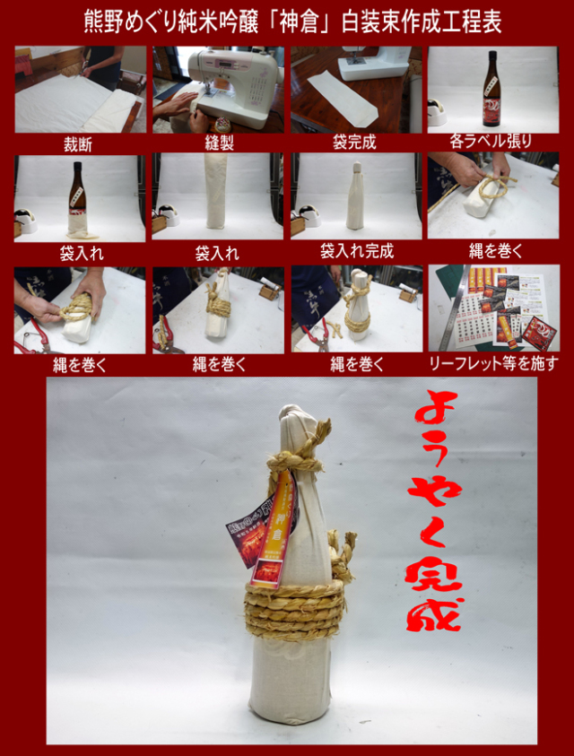 当初は、酒瓶に白い紙(ワックスペーパー)を巻いて縄を巻いたシンプルなデザインでした。 「見た目だけだと、どうもビジュアル的な質感も酒質のオリジナル性も自らの気持ちの上での物足りなさ」を感じ、ビジュアル性、酒質、、一つ一つにまでこだわりをもって、お買い上げいただける一本のお酒がただの日本酒ではなく、地元の熱意と愛情が詰まったお酒であり続けることができるお酒として地酒屋らしく本格的に「熊野めぐり 神倉」を創り上げることにいたりました。