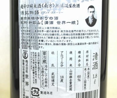 ご案内の南方特別純米超辛口無濾過生原酒は、口に含むと山田錦の旨みがしっかりと口に広がり、中盤にかけて透明感のあるスマートな爽やかな切れを感じさせてくれます。また吟醸酒並みの精米歩合から旨みにも透明感があり喉越しの良さと辛口らしい飲みあきせず付き合ってくれます。